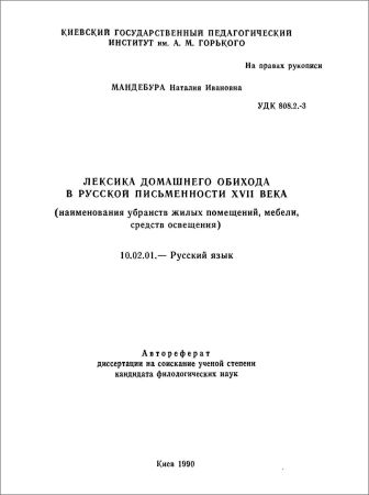 Лексика домашнего обихода в русской письменности XVII века (наименования убранств жилых помещений, мебели, средств освещения) — Цель работы: осуществить семантический и словообразовательный анализ тематических, лексико-семантических групп лексики домашнего обихода XVII века /на материале наименований убранств жилых помещений, мебели, средств освещения/.