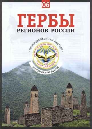Республика Ингушетия — С конца 2015 г. издательством ЗАО «АРИА-АиФ» начата новая серия. «Гербы регионов России» — это полная энциклопедия, посвященная современной России. Достоверная и интересная информация о каждом из регионов нашей страны — история края, особенности географического и геополитического положения, природные богатства и достопримечательности, уникальные места и, конечно, удивительные люди. Шестой выпуск серии «Гербы регионов России» посвящен Республике Ингушетия. Каждый выпуск содержит: — Иллюстрированный журнал, посвященный истории края, его особенностям и достижениям. — Коллекционная медаль, на которой отчеканен герб региона с одной стороны и изображение главной достопримечательности — с другой. — Открытка. Медаль вставлена в центр открытки, сверху защищена от повреждений пластиком.