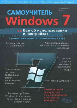 Windows 7 с обновлениями 2012. Все об использовании и настройках. Самоучитель — Данная книга является расширенным самоучителем по Windows 7 и позволяет стать продвинутым пользователем этой системы. Помимо стандартных, но необходимых тем (работа с файлами и папками, оформление Windows 7, Интернет) в книге вы найдете также: рассмотрение реестра Windows 7 и работы с ним, описание управления загрузчиком системы и контроля производительности, отправку факсов в Windows 7 и настройки сетевого принтера, квотирование дискового пространства (какому пользователю сколько места на жестком диске можно использовать) и многое другое. В книге учтены все обновления на конец 2011 года (включая Service Pack 1), что также придает ей дополнительную ценность. Особо хочется отметить наличие таких интересных разделов, как создание виртуальных дисков, использование библиотек Windows 7, справочник по службам Windows 7 с рекомендациями, что надо отключать, а что нет (приведены готовые конфигурации), использование консоли и оснасток Windows 7. Отдельные главы посвящены решению проблем с Windows 7: восстановление Windows 7 в случае краха, встроенные механизмы защиты, как избавиться от синего экрана смерти. По всему ходу изложения приводятся всевозможные трюки и недокументированные возможности (типа как включить "режим бога" в Windows 7, как искусственно вызывается синий экран смерти). Книга написана простым и доступным языком признанными авторами-профессионалами (например, их постоянно обновляемая книга по Windows ХР уже выдержала 9 изданий и до сих пор пользуется заслуженным спросом).
